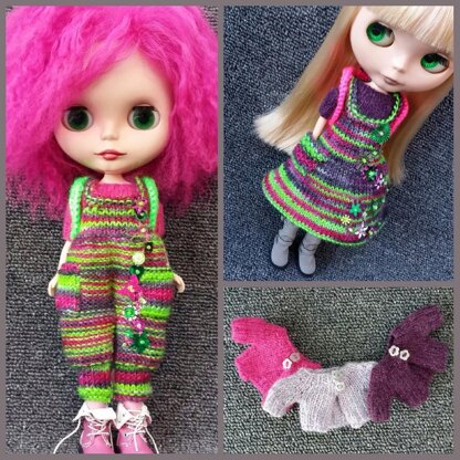 This is a lovely PDF pattern for a knit romper suit, pinafore dress and cropped cardigan for 12" Blythe. Knit flat from sock wool and fine (laceweight) yarn for the cardigan (like I sell in my etsy shop). You will need 2.75mm needles for these.