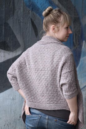 A funky, bolero-like cardigan with unusual construction. The cardigan features a bubble texture and wide garter stitch shawl collar.
