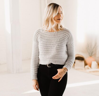 The Body Language Sweater is a simple, drop-shoulder sweater using basic stitches - just the single crochet and half-double crochet stitch! - perfect for a beginner. It’s got a boxy fit with basic shaping around the front + back neckline and a cinching effect at the bottom and on the sleeve cuffs from using a smaller hook for the ribbing which lends to a really modern, flattering fit on all shapes and sizes.