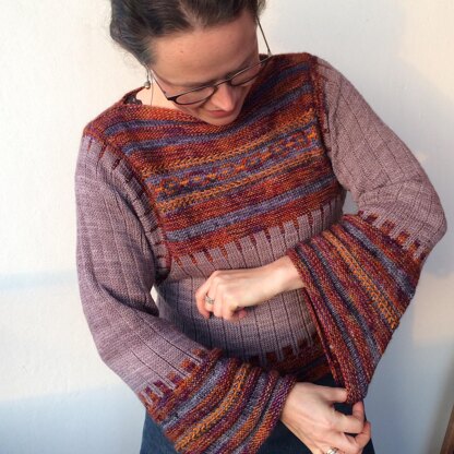 This sweater is worked top-down in the round, starting with the body. At the top there is both variation in color and texture with altering knit and purl sections as well as two Latvian braids and a little bit of stranded colorwork. When the body is finished it is blocked and armholes are created by steeking and then grafting the shoulders together creating a boat-shaped neck. Sleeve stitches are picked up and started with German short-rows to create shaping, then they are finished with similar colorwork as the body.