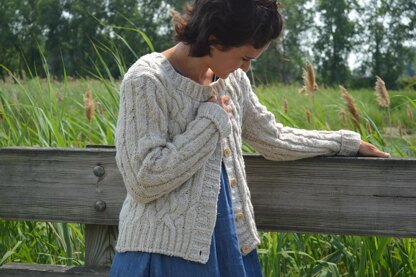 Materials: -Approximately (1,000/ 1,120/ 1,350/ 1,500) yards of Brooklyn Tweed Shelter (or any worsted weight yarn) pictured in Fossil Color -Six 7/8 inch buttons pictured in Fringe Supply Co. Cream Bone