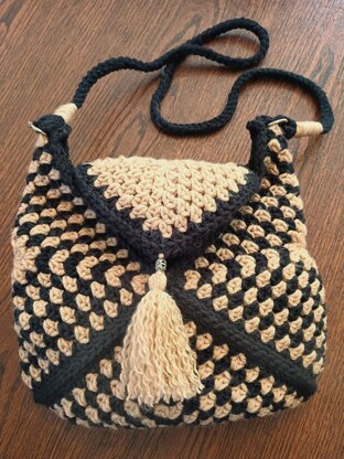 Stylish bag,sure to be a favorite. 3 versions included as samples to show how different the results can be with different color and round combinations. Has decorative front flap, hidden front triangle, inside hanging loop, convertible strap.