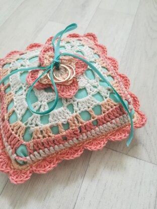 Such a lovely make for weddings! This vintage-inspired crochet ring bearer pillow is made up of two simple blocks, joined with a fancy scalloped edging and topped with pretty petals and ribbon. The contrasting inner is sewn and inserted before the front and back pieces are joined with the edging. You can choose to play with colour, or keep it simple with ivory or just one or two subtle shades.