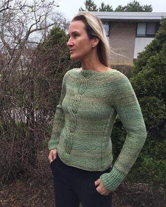 Bold is a comfy cropped sweater with fun texture detail on the extra-long cuffs. It is knit top-down with the stockinette side out on large needles. The jumbo cables are reversible, which means that if you weave the ends in carefully, you will have a completely reversible garment.