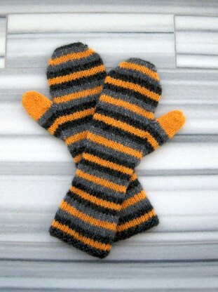 These striped mittens will brighten even the dreariest winter day. Extra long cuffs will keep your wrists toasty warm even when your sleeves ride up or gusts of wind work their way into your coat. The techno yarn is lightweight but warm and extra-soft. It’s lovely to work with and promises not to pill. Three skeins will easily make a pair of mittens and a hat. The finished mittens are quite stretchy and will fit a variety of adult hand shapes and sizes. Most of the shaping for this quick project is done by changing needle size. For smaller hands and a snugger fit, work the hand using the small needles instead of medium. Difficulty: easy-intermediate Finished measurements: arm circumference 81/2”/22cm; wrist circumference 7”/18cm; hand circumference 8”/20cm cuff length: 7”/17.8cm; length to fingertips 14”/35.6cm
