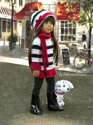 Bon~Bon ~ a stylish tunic sweater/dress with a Parisian flair, complete with slightly over-sized cloche style hat and trendy scarf for a chic outfit suitable for city life yet casual enough for play wear for the slim 18” Kidz ‘n’ Cats girls
