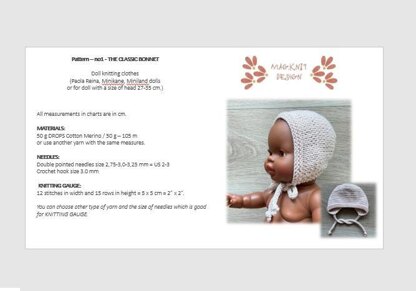 Model: Bonnet classic Level: Beginner After payment you will receive PDF file with particular description with pictures to knit bonnet for your doll.
