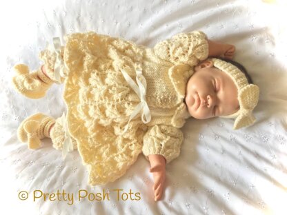 pdf pattern Bonnie Bows dress , pants shoes and headband set complete pattern to make a dress ,headband, pants and shoes features a creeping vine design on the dress and pants .can be made in 3 sizes and a variation of colours. sizes 18"-20"reborn or newborn baby 0-3 months(16") 3-6 months ( 18 ") knitted in double knit wool . requires 200g dk wool depending 5 buttons. matching ribbon 3.25mm needles. 3.75mm needles 4mm needles.
