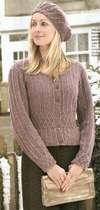 Feel elegant in this long sleeved cardigan with peplum in fine cable over reverse stocking stitch background, with matching beret. The fine cable is a twist stitch not requiring a cable needle, however the lattice work details at cuffs and waist do require a little use of the cable needle.