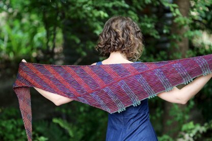 Boomerangle is a long asymmetric triangle designed for experimenting with colour and contrast. The body of the shawl is worked sideways, alternating between garter and stockinette to create a slightly shot fabric, which are intersected by strong slip stitch lines.