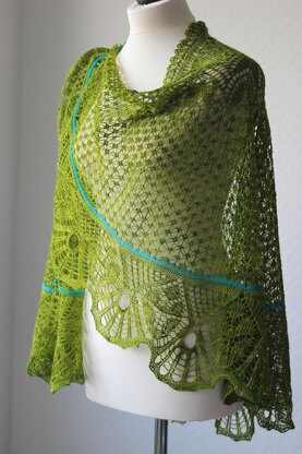 Boon Lay is a generous and elegant, crescent-y shawl that ends in a spectacular border of billowing flowers & fans. Three additional lace motifs and two different mesh patterns create an interesting interplay of textures along the way.