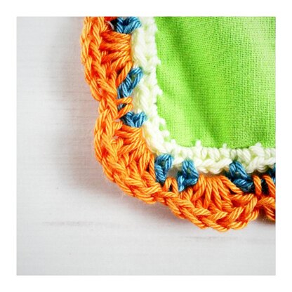 Requirements: 4mm Crochet Hook 75g DK Mercerised Cotton Yarn Darning Needle Fabric item (bag/tea towel)