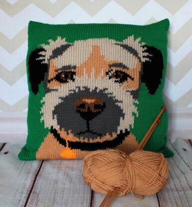 Knitted cushion cover pattern featuring a Border Terrier dog in a fun pop art style! This can be used to cover a cushion pad, or a box canvas if you’d prefer to display your hard work on the wall and have a unique piece of art!