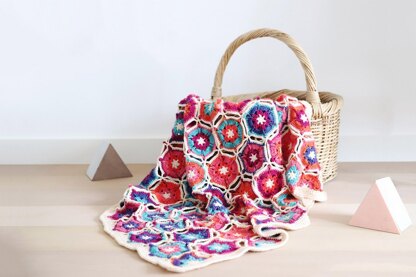 Feast your eyes on the Borealis blanket! The motifs resemble little snowflakes in different colours of the Northern lights. The blanket is joined and bordered in white, making the colours stand out even more. The blanket measures 90 x 120 cm (35.5 x 47in) but is easily adaptable in size. The pattern contains written instructions and crochet diagrams, and is written in US terms. The Borealis Blanket is suitable for advanced beginners or intermediate crocheters.