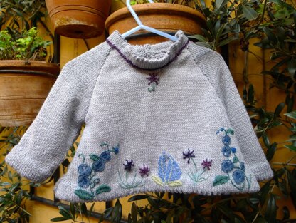 This  A line smock top with raglan sleeves is a great design for free hand embroidery. I have used Appletons Fine Embroidery Wool as it has beautiful natural colours and is lovely to work with. Use a washable embroidery pen to sketch the basic design of your embroidery and work from the middle flower out. No two designs will be exactly the same and you will end up with your own very unique piece. Choose your colours to suit your own baby or the baby you are making it for. I used these shades as they went well with this lovely dove grey. Take your time with the embroidery especially if you have not embroidered on knitting before. You cannot really use a hoop. Just don’t pull anything very tight. Use the photography as a guide but don't feel you have to make a complete replica. Even just a few simple flowers looks very sweet and will be greatly appreciated by a new Mother. Some knitters find it easier to embroider the front prior to sewing up the garment. A lovely comfortable stylish top