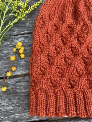 The Botetourt Beanie is worked from the bottom up. The ribbed brim is worked on smaller needles; the body of the hat is worked with the larger needles in a cable stitch pattern called Double Honeycomb. It contains four stitch cable crosses (2/2 Left Cross and 2/2 Right Cross), with little two stitch cable crosses inside (1/1 Left Cross and 1/1 Right Cross), giving a little “dimple” inside each four stitch cable cross.