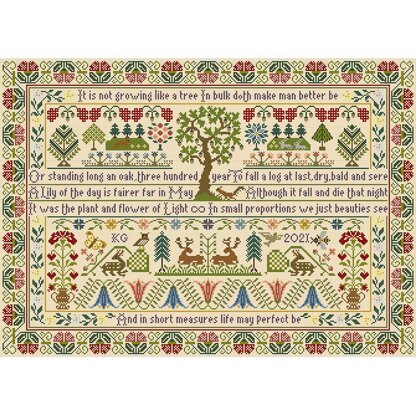 Moira Blackburn Oak Tree. Your kit contains: 16 count parchment Zweigart Aida, pre-sorted stranded cottons and a bundle, needle, stitch diagram and instructions (including alphabet and number line for personalisation). Finished size 53cm by 38cm. This kit uses full cross stitches and a little back stitch.