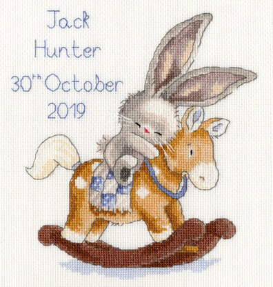Rock A Bye Bunny Cross Stitch KitThis cute Bebunni design is brought to you in cross stitch by Bothy Threads. Featuring an adorable baby bunny cuddling his/her rocking horse. The finished project would make a perfect gift for a newborn. Your kit contains: 14 count white Zweigart Aida, pre-sorted stranded cotton, needle, stitch diagram and instructions. This kit uses cross stitch, occasional fractionals and back stitch. Threads are provided to work the design in either blue or pink.