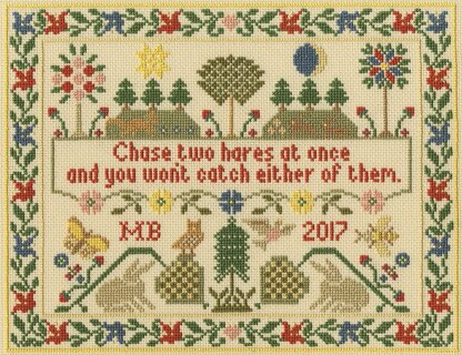 Finished design size 27 x 22cm. Two Hares traditional sampler cross stitch kit. Your kit contains chart and instructions, needle, 16 count parchment Aida fabric and presorted stranded cotton threads on a loaded thread organiser. Stitches used in this kit are full cross stitch only. Design by ©Moira Blackburn