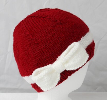 An eye-popping, fitted cap with instructions for five different sizes. There are also two options for the edge of the contrasting color band. The cap is knitted in the round of two colors. May I suggest the colors of your school, alma mater, or favorite sports team! The bow is knitted separately and sewn on. Show your spirit and look fabulous doing it! Size Measured Head Circumference Baby 18½" Child 19½" Teen 20½" Adult 22" Large Adult 23"