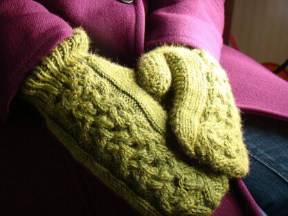 Elegant and mind-boggling complex looking cables are set in a simple shape, with a grippy practical seed stitch palm.