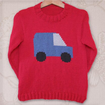 This is my classic childrens round neck set in sleeve sweater pattern with a image of a simple side profile of a old style boxy car on the front.