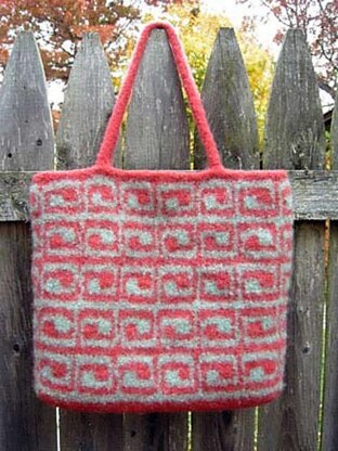 This knitting pattern of a felted bag is worked with a single strand of worsted weight throughout, except for handles.