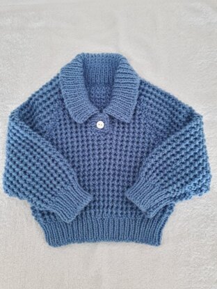 Long sleeved shirt style sweater, knitted in an easy 2 row pattern, simple but effective. The collar is knitted as a separate piece and sewn on afterwards, so has simple shaping.