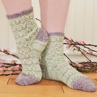 Sock is knit from the toe-up with a gusset and eye of partridge heel. Ribbing under the arch makes for a snug fit. CC is striped subtly throughout the lace pattern, and is easiest if carried up the inside of the foot between stripes. Sample used all of CC, so if a longer cuff or larger sock is desired, omit striping. Notes regarding length are given throughout pattern. To change width of sock, adjust stitch gauge by changing needle size up or down.