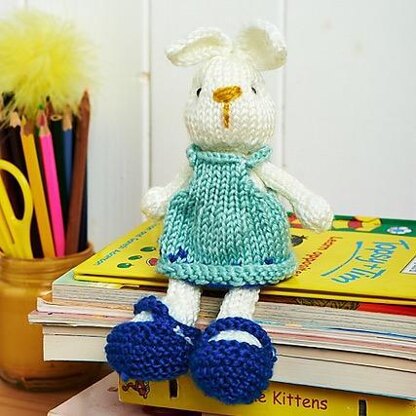 Bramble Bunny is choosing what to wear today … there is a pretty summer dress, skirt, sweater, jacket and shoes to choose from. Designed by Amanda Berry @fluffandfuzz, the bunny and outfits are knitted in acrylic DK yarns on single pointed needles (not in the round). For confident beginners and above, all pieces are knitted flat (back and forth) on a pair of straight single-pointed knitting needles. The dress straps and shoe straps are single crochet chains worked on a crochet hook. The dress pattern incorporates Fair-isle (stranded) colour-work. You will also need to cast on and off, knit, purl, work increases and decreases, and seaming to finish.
