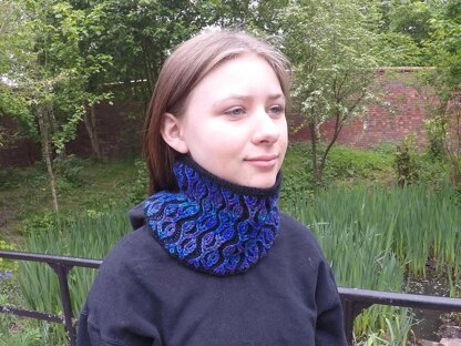 The cowl is knitted in the smallest size which is 50 cm and is modeled on someone who takes women’s small clothing size. Other sizes can be made by casting on a larger number of stitches. The pattern repeat is over six stitches.