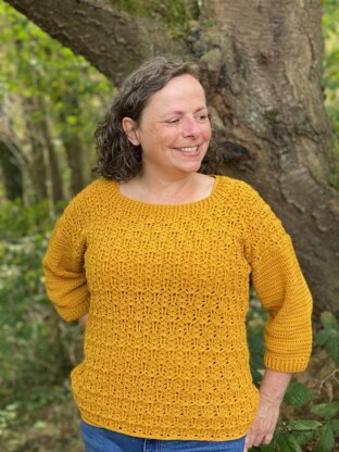 The sweater is crocheted in pieces starting from the bottom upwards. Sides and shouders are seamed. Sleeves are worked straight on to the body and worked in rounds.