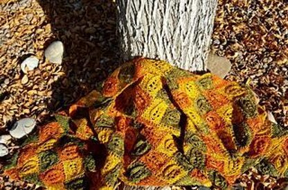 Broken Leaves is a rectangular entrelac shawl, incorporating leaf motifs within each block. An Aran weight yarn makes this a warm cozy wrap good for the dropping temperatures during autumn.