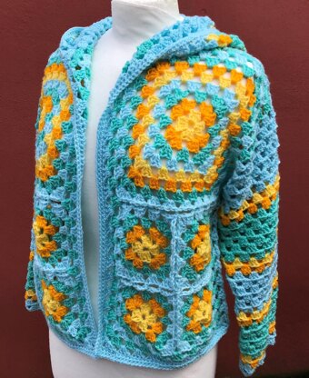 The squares are joined as you go, so there’s no seaming afterwards. The sleeves are worked in the round downwards from the shoulder to the cuff. The hood is worked upwards in one piece and there’s a short seam to close the top of the hood. This seam is worked in ss and can’t be seen, even when the hood is down. This pattern is great for using up yarn scraps.