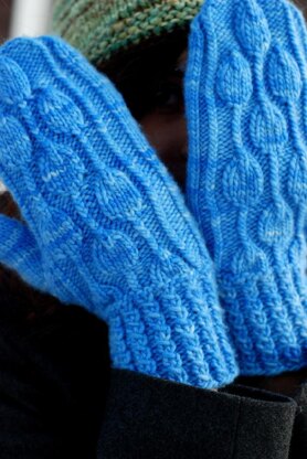 Worked in soft Malabrigo, the balloon motif on the back of the hands continues the air theme. The mock cable on the cuffs keep the mittens snug to help ward off icy winds.