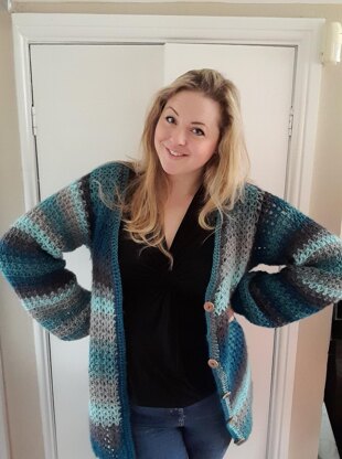 The breeze crochet cardigan is a slightly slouchy, oversized cardigan for layering and chilly evenings. Wear it with your favourite jeans or over a dress- it is so versatile! It is available in 7 sizes from 32" to 56". This cardigan has 2 inches positive ease so if you are a size 32", the finished item will be a 34". This is written in US crochet terms. The button bands, hem and side panels are made using double crochet stitch and the front, back and sleeves are made with V stitch. The body of the cardigan is worked flat in 3 pieces and the sleeves are worked in the round.