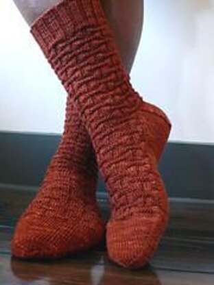 A top-down sock in four sizes, with a robust knit/purl brickwork pattern leading down the leg and over the top of the foot. Motif is reversible for toe-up construction. Substituting needles and/or yarn may result in an overall variation in size.