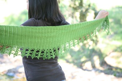 Bridgette is a long shallow crescent shawl with a geometric lacy border. The body of the shawl consists of soft, squishy ribbing. Currently on sale for Indie June!