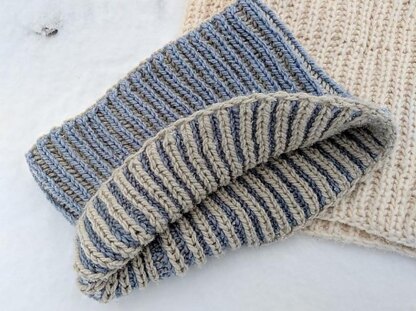 This cowl is worked in the round in brioche stitch in two colors. Each round is worked with one color. This is a great project for anyone trying out brioche in two colors for the first time, or anyone who needs a relaxing knit with a stunning results. Worked in bulky yarn the cowl is finished fast and the color combinations are endless. Sample is done in Cascade 128 Superwash in Dusty Blue and Feather Grey color. You will need approximately 115 yards of yarn in each color. Finished Size: 27” (69 cm)” wide (circumference) x 9” (23 cm) high.