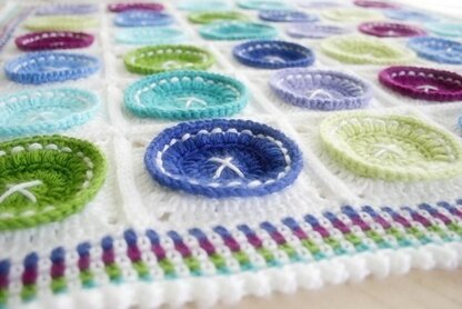 "Button, button, who's got the button" blanket? With a love of buttons and bright colors, I designed this blanket pattern to be easily created in your own color scheme and size. Make more squares and make an afghan or bedcover. Bust your stash and use your own colors to match any nursery or home decor.