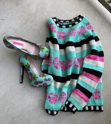 So bright and bold! This sweater was inspired by my favorite pair of shoes. It is knit in the round, top down, seamlessly. It has alternating rows of big beautiful colorwork roses and bold stripes. The neck, bottom hem, and sleeve cuffs are adorned with alternating squares of color. FINISHED MEASUREMENTS Sizes 1, (2, 3, 4, 5, 6, 7, 8) Chest Circumference: 36.8 (40, 45, 48, 51, 56.7, 60, 65)in/93.5 (102, 114, 122, 130, 144, 152, 165)cm. Arm Length: 17.5in/44cm. Upper Arm Circumference: 11 (12, 12.5, 13, 14, 15.5, 17.5, 19)in/28 (30.5, 32, 33, 36, 39, 44.5, 48)cm. Length of body from underarm: 15in/38cm. Length of neck and yoke: 9 (9, 9.5, 10, 10, 10.5, 10.5, 11)in/23 (23, 24, 25, 25, 27,27, 28)cm. Total length of sweater: 24 (24, 25, 25, 25, 26, 26, 26)in/61, (61, 63.5, 63.5, 63.5, 66, 66, 66)cm.Yarn: Madtosh Euro Sock 100% Merino wool, Fingering weight 435yds. Adelaide by Primrose Yarn Co., Fingering weight 100% Superwash Merino 435 yds/skein single ply.