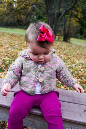 Easy baby hooded jacket/cardigan in stockinette with seed stitch (British Moss Stitch) edges, sleeves, and hood. Pattern includes sizes 3, 6, 12 months (which also fits a Vermont Teddy Bear), 2 and 4. Directions included for knitting sleeves flat or in the round, and for choice of closures- zipper, buttons and button holes, buttons and loops, or tie closures. Skills needed include casting on and off, knit and purl, increasing and decreasing.