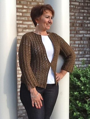 This classic cardigan is a wardrobe must with endless versatility. Crew neck. ¾ length sleeves with slit detail. Easy lace pattern bordered by a dainty garter stitch edging at neckline, cuffs and hem.