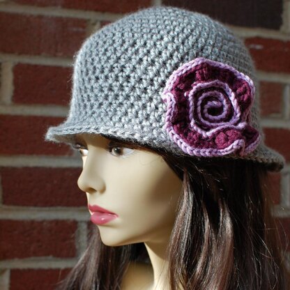 This trendy hat is both functional and fashionable. The pattern includes directions to make one size of the hat and the swirl flower.