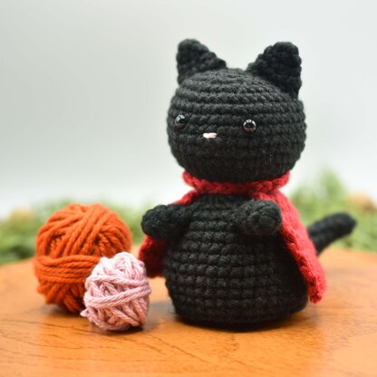 Brio the Cat joins the Halloween party in its red cape. Being a cat, Brio would love to be part of your life. Being a Brio, the cat loves music, especially played "allegro con brio" (lively and energetically). The black cat amigurumi make great Halloween decorations.