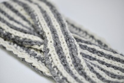 Dieses schnelle und einfache Wende-Stirnband ist auf der einen Seite gestreift, auf der anderen Seite texturiert – dank des zweifarbigen Glattpatent-Musters. Die gezopfte Drehung in der Mitte sieht nicht nur gut aus, sie sorgt auch dafür, dass das Stirnband nicht zu weit in die Stirn rutscht.