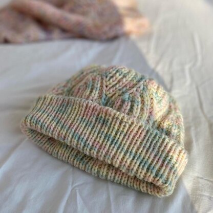 BriocheBernie is a beanie worked in a half fisherman´s rib pattern. In the beginning, knit the folded edge in rib, after which the beanie is knitted around in the half fisherman’s rib pattern which ends with decreases. The beanie is assembly-free.