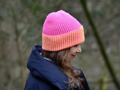 Brionia hat is knitted in the round in simple brioche using two contrast colours. The hat brim is knitted in two colour brioche, the body of hat is knitted in one colour brioche.