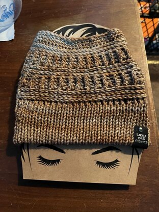 This is a messy bun hat that featured a rib using front and back post with section of half double crochet in the 3rd loop to add texted to the hat. Can be made with any worsted weight yarn. Light worsted will use an I hook and Aran weight a J hook. Pattern is written with sizes for teen and adult.