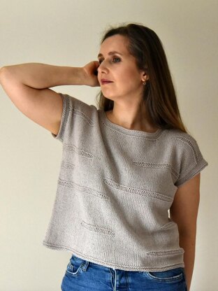 The tee is knitted in the round from bottom up to underarms, the top parts of Front and Back are knitted separately back and forth. After shoulders are seamed, the stitches are picked up for neck and sleeve bands. The garment is knitted in stockinette stitch and the front is decorated with horizontal lacy stripes in different length, which are formed by elongated stitches. The recommended positive ease is 10-18 cm/4 - 7 inches.